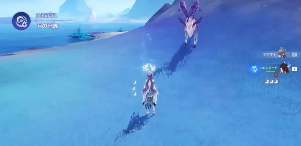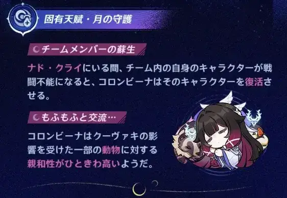 コロンビーナの固有天賦「月の守護」により、ナド・クライエリア限定で戦闘不能になったキャラクターを復活させることが可能です。