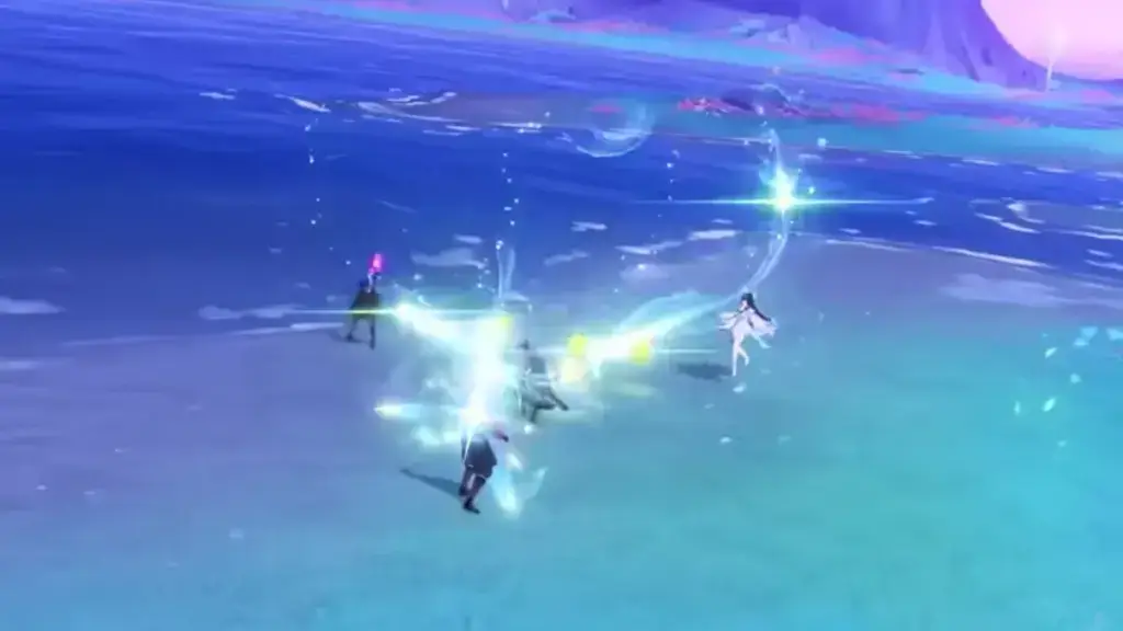 1つめの効果は、周囲の敵に継続的に水元素ダメージを与える「引力のさざ波」です。コロンビーナが控えに移動しても、効果は継続します。