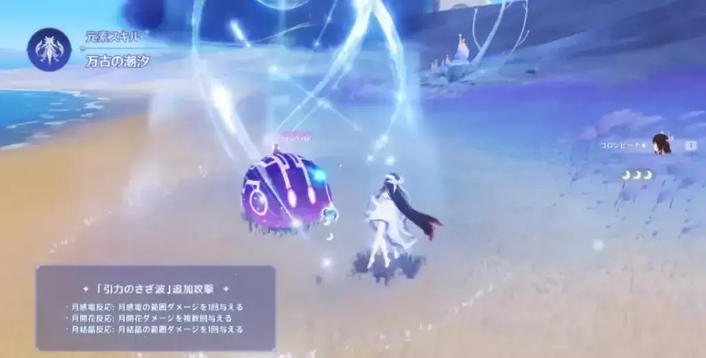 コロンビーナの元素爆発は、「月の領域」を生成します。元素爆発を使用すると、月の領域内にいる表のキャラクターの月反応を強化する効果があります。